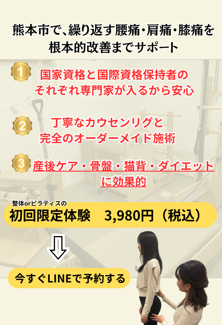 熊本市中央区・新大江で、整体・ピラティス・鍼灸をまとめて受けられる熊本初のトータルコンディションニング。国家資格と国際資格のコンビがお客様の身体の不調からボディメイクを結果にこだわり徹底できに寄り添います。